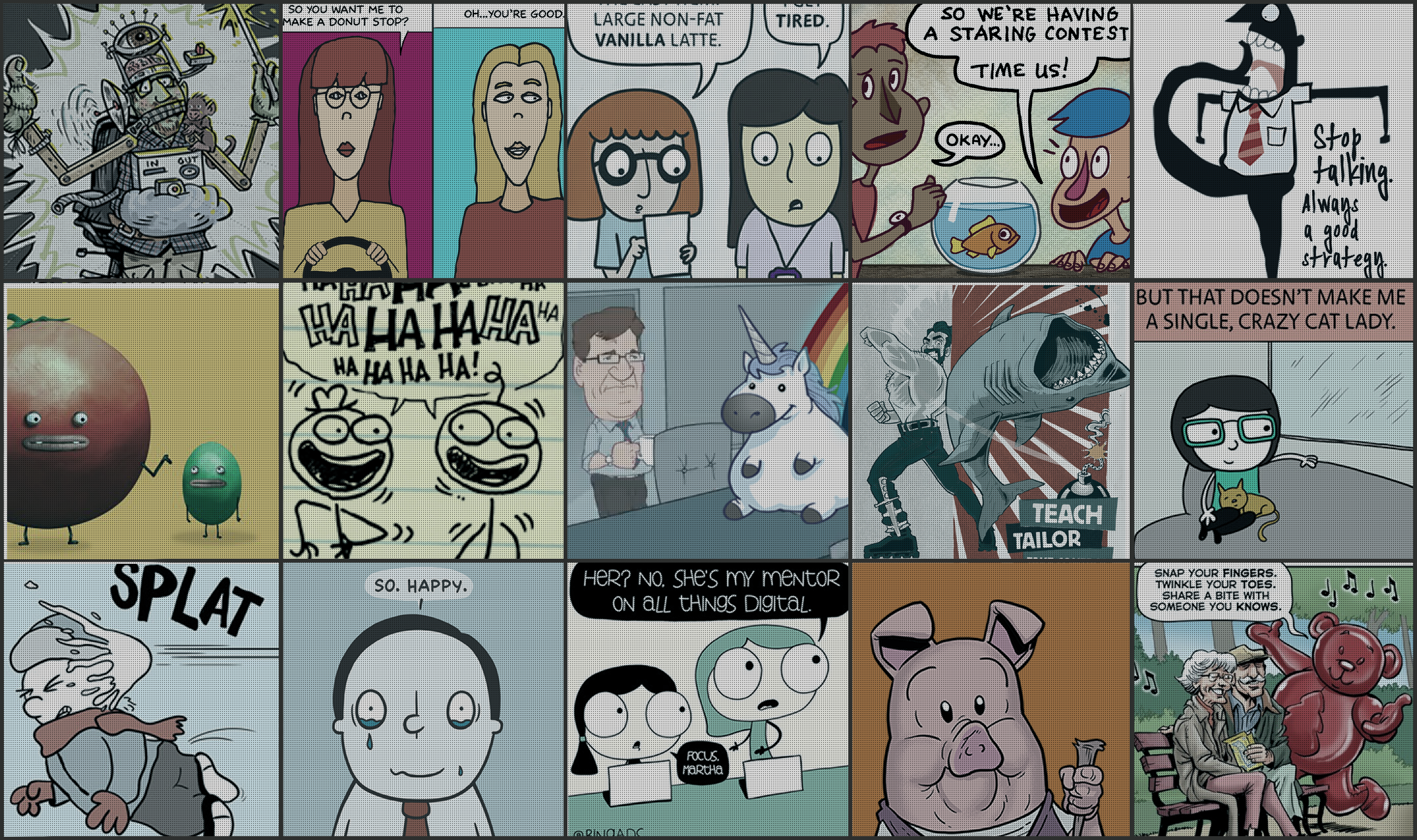 That's right. We specialize in big-eyed funnies that reach out and grab your audience by the heart. Our characters and stories are alive, vibrant, and bursting with personality. They add a relatable voice to your message. They delight while they inform. They build relationships that last much longer than a random tweet.